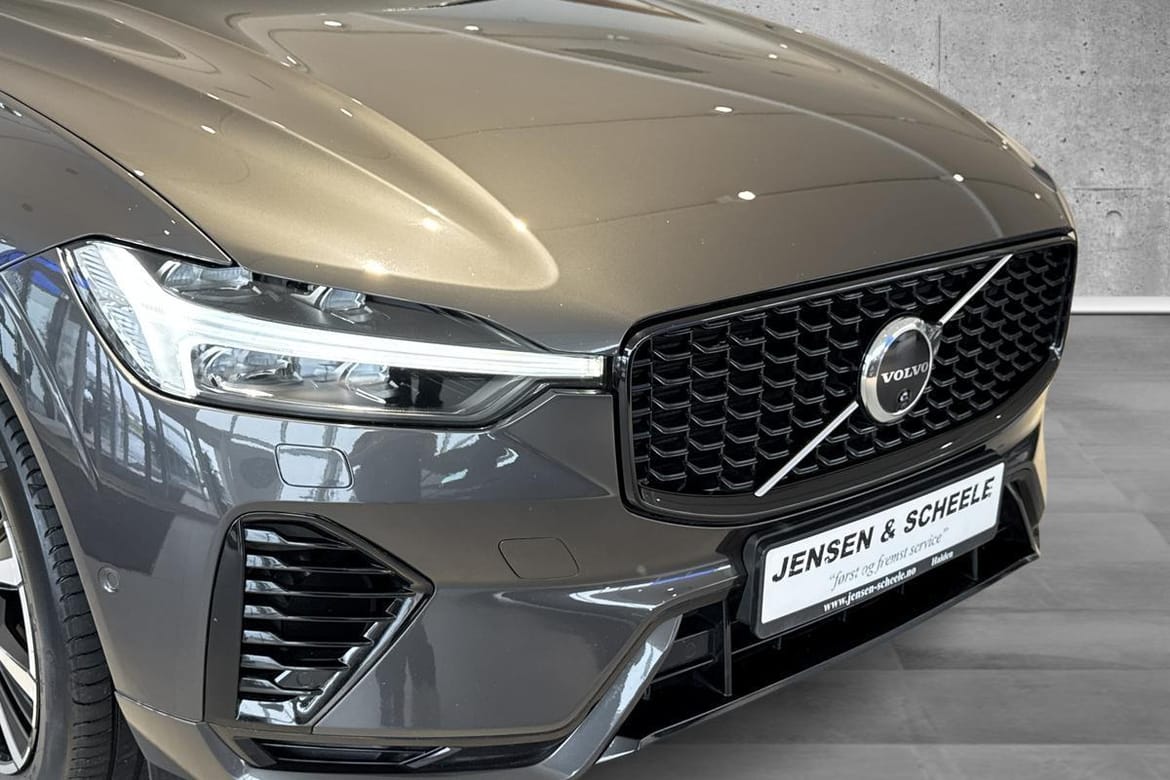 Kraftfull og elegant Volvo XC60 Recharge T8 Plug-in Hybrid i den stilrene fargen Platinum Grey. Dette er Ultimate Dark-utgaven kombinert med mørke og sportslige detaljer som gir bilen et eksklusivt preg.